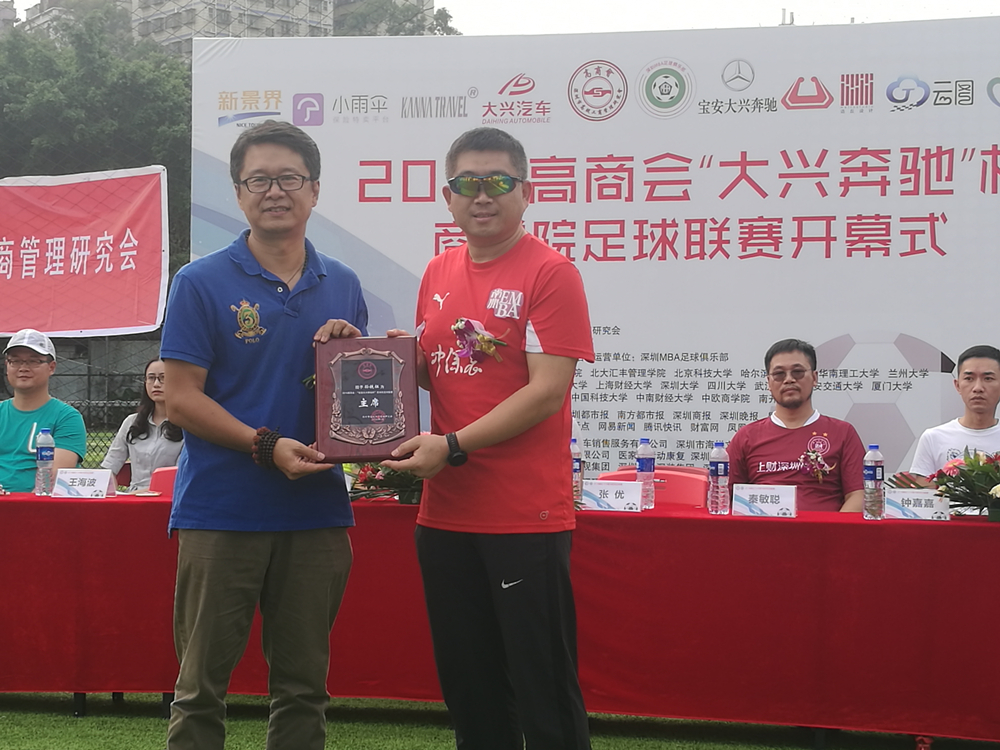 足球联赛组委会主席交接仪式(图左:深圳市MBA足球俱乐部主席孙铁征。图右:2017年EMBA足球赛组委会副主席王海波。)