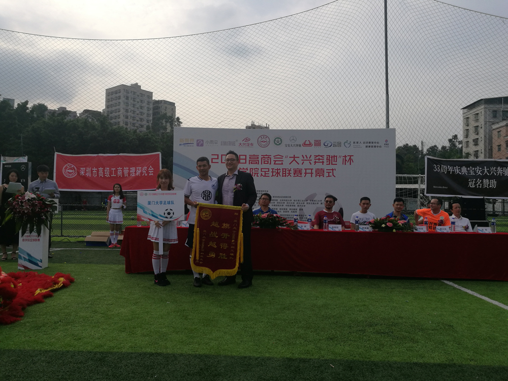 授旗仪式:厦门大学EMBA深圳校友会秘书长张优(图右)为厦门大学足球队授旗