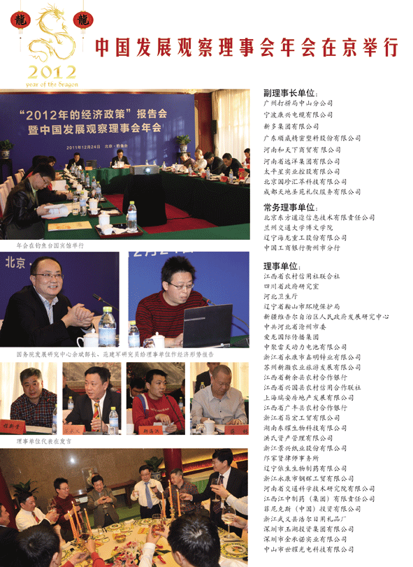 2011年12月24日,中国发展观察理事会年会在北京钓鱼台国宾馆召开。会议由中国发展观察杂志社总编辑、理事会副理事长卫建民主持,理事会秘书长徐迅做工作报告。中国发展观察杂志社社长、理事会理事长鲁志强出席会议。
